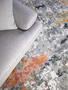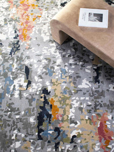 Featuring a luxurious texture and subtle shine, the Chama Rug is a stunning addition to any room. Its combination of pure artistry and exceptional craftsmanship is evident in its handwoven design using Dapsylc fibres. The luminous silvery-grey base is adorned with a painterly abstract pattern, infused with hints of pink, blue, peach-orange, and black for added depth and allure. Dapsylc is an innovative, sustainable polyester yarn made from GRS-certified recycled fibres, known for its softness and durability. Whether in a residential or commercial space, this rug offers an effortlessly sophisticated aesthetic with a silk-like feel underfoot.